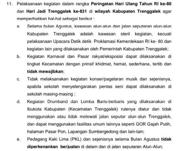 - Selama bulan Agustus, kawasan alun-alun dan jalan seputaran alun-alun Kabupaten Trenggalek adalah kawasan steril kegiatan, kecuali pelaksanaan Upacara Detik detik Proklamasi Kemerdekaan RI ke- 80 dan kegiatan lain yang dilaksanakan oleh Pemerintah Kabupaten Trenggalek.